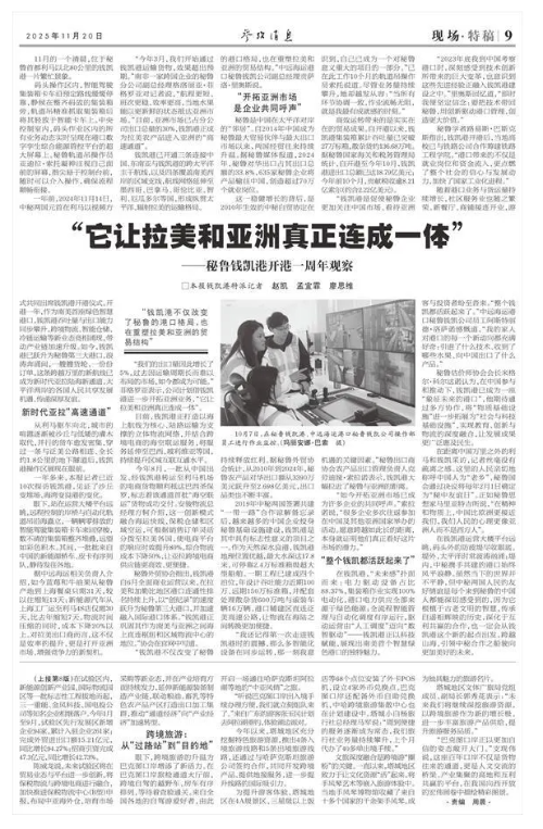 新华社北京11月21日电 《参考消息》近日刊发文章《“它让拉美和亚洲真正连成一体”——秘鲁钱凯港开港一周年观察》。全文如下: 11月的一个清晨,位于秘鲁首都利马以北80公里的钱凯港一片繁忙景象。 码头操作区内,智能驾驶集装箱卡车沿预定路线缓缓停靠,静候在整齐码放的集装箱旁,轨道吊精准抓取集装箱后将其轻放于智能卡车上。中央控制室内,码头作业区内的所有业务动态实时呈现在港口数字孪生综合能源管控平台的超大屏幕上。秘鲁轨道吊操作员亚迪拉·索托凝神注视自己面前的屏幕,指尖悬于控制台前,随时可以介入操作,确保流程顺畅衔接。 一年前,2024年11月14日,中秘两国元首在利马以视频方式共同出席钱凯港开港仪式。开港一年,作为南美首座绿色智慧港口,钱凯港吞吐量与出口能力同步攀升,跨境物流、智能仓储、冷链运输等新业态竞相涌现,带动产业链加速升级。如今,钱凯港已跃升为秘鲁第三大港口,浪涛奔涌间,一艘艘货轮、一份份订单,这条跨越万里的新航线已成为新时代亚拉陆海新通道,太平洋两岸的各国人民共享发展机遇、传递深厚友谊。 新时代亚拉“高速通道” 从利马驱车向北,城市的喧嚣逐渐被沙丘与低矮的灌木取代,并行的货车愈发密集,穿过一条与泛美公路相连、全长约1.8公里的地下隧道后,钱凯港操作区展现在眼前。 一年多来,本报记者已近10次探访钱凯港,见证了沙丘变堆场、海湾变良港的变化。 眼下,站在运营大楼平台远眺,远程控制的岸桥与自动化轨道吊沿海矗立,一辆辆零排放的智能驾驶集装箱卡车来回穿梭,数不清的集装箱整齐堆叠,远望如彩色积木。其间,一批批来自中国的新能源轿车、皮卡有序列队,静待发往各地。 据中远海运相关负责人介绍,如今蓝莓和牛油果从秘鲁产地到上海餐桌只需31天,较以往缩短13天;新能源汽车从上海工厂运至利马4S店仅需30天,比去年缩短7天。物流时间压缩的同时,成本下降20%以上。对拉美出口商而言,这不仅是效率的提升,更是打开亚洲市场、增强竞争力的新契机。 “今年3月,我们开始通过钱凯港运输货物,效果超出预期。”南非一家跨国企业的秘鲁分公司副总经理格洛丽亚·菲格罗亚对记者说,“航程更短、班次更稳、效率更高,当地水果能以更新鲜的状态抵达亚洲市场。”目前,亚洲市场已占分公司出口总量的30%,钱凯港正成为拉美农产品进入亚洲的“高速通道”。 钱凯港已开通三条连接中国、东南亚与钱凯港的跨太平洋主干航线,以及四条覆盖南美西岸的区域支线,航线网络延伸至墨西哥、巴拿马、哥伦比亚、智利、厄瓜多尔等国,形成纵贯太平洋、辐射拉美的运输格局。 “我们的出口量因此增长了5%,过去因运输周期长而难以布局的市场,如今都成为可能。”菲格罗亚表示,公司计划借钱凯港进一步开拓亚洲业务,“它让拉美和亚洲真正连成一体”。 目前,钱凯港正打造以海上航线为核心、陆路运输为支撑的立体物流网络,并结合跨境电商的海空联运服务,将服务延伸至巴西、玻利维亚等国,持续提升区域互联互通水平。 今年8月,一批从中国出发、经钱凯港转运至利马机场的电商货物顺利抵达巴西圣保罗,标志着该通道首批“海空联运”货物成功交付。安骏物流总经理方轲介绍,这一创新模式融合海运快线、保税仓储和区域空运,可根据销售订单灵活分拨至拉美各国,使电商平台的响应时效提升80%,综合物流成本下降50%,让亚拉跨境电商供应链更高效、更便捷。 秘鲁外贸协会指出,钱凯港自6月全面商业运营以来,在拉美和加勒比地区港口连通性排名持续上升,以“创纪录”的速度跃升为秘鲁第三大港口,并加速融入国际港口体系。“钱凯港正巩固其作为南美与亚洲之间海上直连枢纽和区域物流中心的地位。”协会在官网中写道。 “钱凯港不仅改变了秘鲁的港口格局,也在重塑拉美和亚洲的贸易结构。”中远海运港口秘鲁钱凯公司副总经理贡萨洛·里奥斯说。 “开拓亚洲市场是企业共同呼声” 秘鲁是中国在太平洋对岸的“邻居”。自2014年中国成为秘鲁最大贸易伙伴与最大出口市场以来,两国经贸往来持续升温。据秘鲁媒体报道,2024年,秘鲁对华出口占其出口总额的33.8%,635家秘鲁企业将产品输往中国,创造超过70万个就业岗位。 这一稳健增长的背后,是2010年生效的中秘自贸协定在持续释放红利。据秘鲁外贸协会统计,从2010年到2024年,秘鲁农产品对华出口额从3390万美元跃升至2.698亿美元,出口品类也不断丰富。 2019年中秘两国签署共建“一带一路”合作谅解备忘录后,越来越多的中国企业投身秘鲁基础设施建设,钱凯港是其中具有标志性意义的项目之一。作为天然深水良港,钱凯港地理位置优越,最大水深达17.8米,可停靠2.4万标准箱级超大型船舶。一期工程已建成四个泊位,年设计吞吐能力近期100万、远期150万标准箱,并配套处理散杂货600万吨与滚装车辆16万辆。港口辅建区直连泛美高速公路,让物流在海陆之间转换更加便捷。 “我还记得第一次走进钱凯港时的震撼,那么多智能化设备在同步运转,那一刻我意识到,自己已成为一个对秘鲁意义重大的项目的一部分。”已在此工作10个月的轨道吊操作员索托说道。尽管业务量持续攀升,她却越发从容:“当所有环节协调一致,作业流畅无阻,就是我最有成就感的时刻。” 高效运转带来的是实实在在的贸易成果。自开港以来