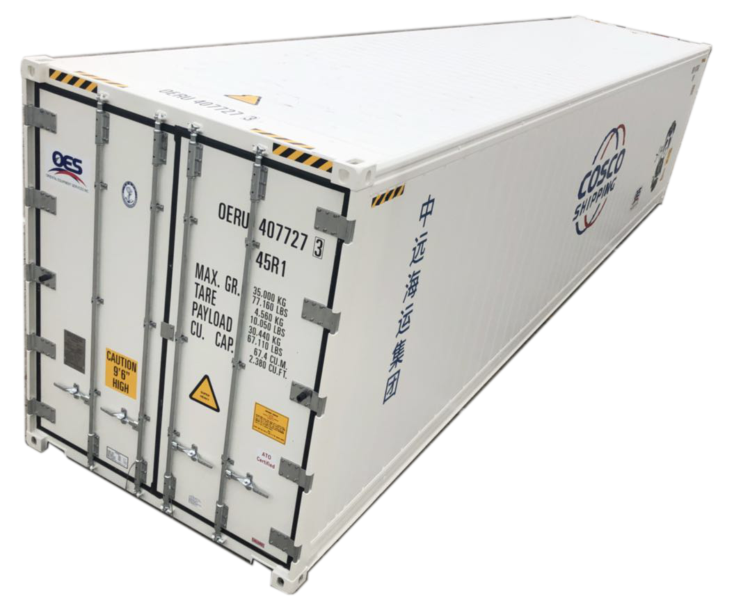 TYPE 箱型 | 45R1 | External 箱外 | Weights 重量 | Length长度 | Width宽度 | Height高度 | Max Gross Weight最大总重 | Tare Weight 自重 | Max Payload 最大载重 | 12,192 mm | 2,438 mm | 2,896 mm | 34,000 Kg | 4,480 Kg | 29,520 Kg | 40’ | 8’ | 9’6” | 74,960 Lbs | 9,880 Lbs | 65,080 Lbs | Internal 箱内 | Door Opening 开门尺寸 | Length 长度 | Width 宽度 | Height 高度 | Width 宽度 | Height 高度 | 11,590 mm | 2,290 mm | 2,557.5 mm | 2,294 mm | 2,569 mm | 38’ 19/64” | 7’-6 5/32” | 8’-4 11/16” | 7’-6 5/16” | 8’-5 9/64” | Allowable Stacking Weight 允许堆码重量 | Cubic Capacity 容积 | 216,000 Kg | 476,200 Lbs | 67.9 M3 | 2400 FT3 | Special Feature 特点 | 1. External environmental temperature range from -40°C to +50°C, controllable internal temperature range from -25°C to +25°C. 外部环境温度-40°C至+50°C, 内部可控温度-25°C至+25°C。 1. T-floor, Aluminum scuff lining. T地板,铝防撞板。 |